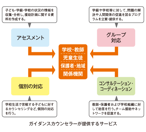 登校しぶりが見え始めた中学生の保護者からいじめの訴えを受け,本人ならびに母親との面談を行いました。教頭が子どもに頻繁に声をかけること,いじめを見つけたら担任がその場で毅然と指導することとし,相談室と保健室を避難場所にしました。子どもと保護者へのカウンセリングを継続したところ,子どもに発達の偏りがあることがわかり,通級指導教室に通いました。いじめはなくなり,元気に高校生活を送っています。4 コンサルテーション/コーディネーション