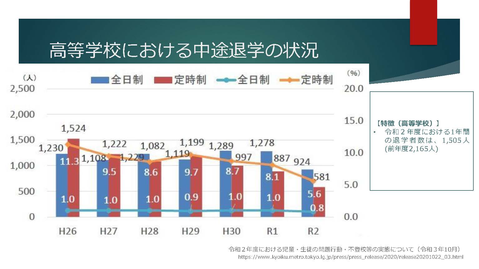 続いて,「東京都教育委員会が把握している成果」として東京都教育庁指導部高等学校教育指導課主任指導主事である久保田哲司氏よりご講演いただきました。平成21年度から令和2年度までの都立高校の長期欠席者は現在約7000人であり,課程別の内訳を見ると,令和2年度では全日制では増加傾向、定時制では減少傾向にあることがグラフにより示されました(図①)。