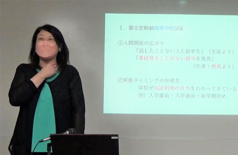 丸山氏も同じくSGEの講師としてこの事業に関わっており,その経験から小中学校との関連まで広げたお話がありました。SGEの実践をするなかで「話したことのない人と話せた」という生徒がとても多く人間関係作りに効果があること,例えば入学式前など導入の時期を考えて実施することでより効果が得られたことが話されました。